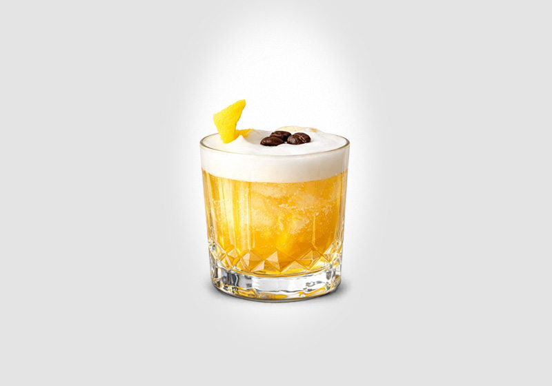 Skaka samtliga ingredienser med is och sila upp i ett rocksglas med ny is. Garnera med en citronzest.