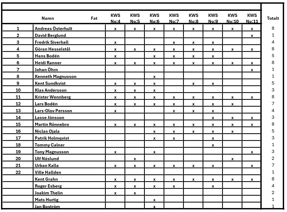 Betyg: 79,2 pMackmyra KWS No. 2 55,6% Sällskapets andra fat blev ett rökigt Mackmyra jubileumsfat med kropp av amerikansk ek och lock av ny svensk ek där de för första gången låtit spårfräsa mönster i lock och botten för att ytterligare utveckla kraften i den svenska eken. Fattyp var Amerikansk och svensk ek. Fylldes: 2019-11-18 och tappades: 2024-05-21 Lagringstid var: 4 år, 5 månader.